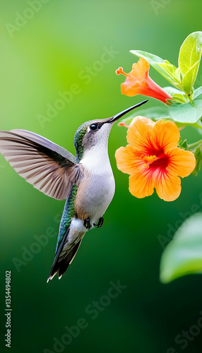 © EGIVSITI, Fototapeta premium Hummingbird in flight, feeding from an orange flower