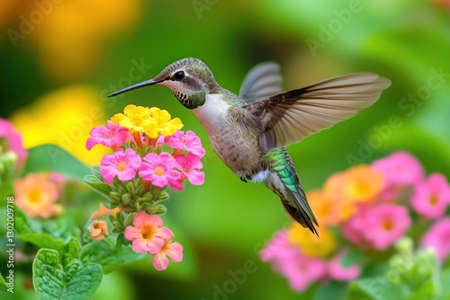 © malayeka, Obraz premium Hummingbird in flight feeding on colorful flowers.