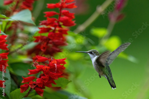 Fototapeta premium hummingbird in flight feeding on flower in lush vegetation in summer.