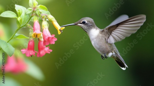 Obraz premium Hummingbird in Flight, Feeding on Flowers