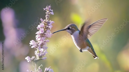 © Luxetify, Fototapeta premium Hummingbird in Flight, Feeding on Purple Flowers