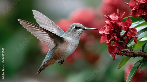 Naklejka premium Hummingbird in Flight, Feeding on Red Flowers A Stunning Nature Photograph