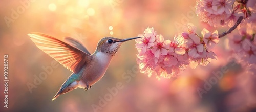 Naklejka premium Hummingbird in Flight, Gathering Nectar from Cherry Blossoms