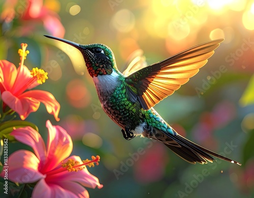 © Hiu, Fototapeta premium Hummingbird in flight, illuminated by sunlight near blooming pink flowers