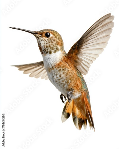 © Dani, Fototapeta premium Hummingbird in Flight Isolated on White.Detailed image of a hummingbird hovering in flight on a white background. Capturing motion, wing speed, and the bird’s vibrant feathers