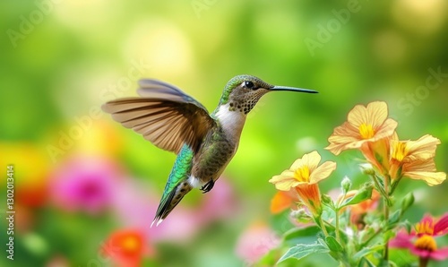 Fototapeta premium Hummingbird in flight near colorful flowers.