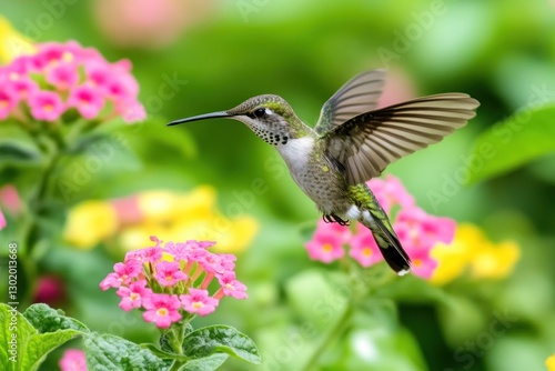 Fototapeta premium Hummingbird in flight near colorful flowers.