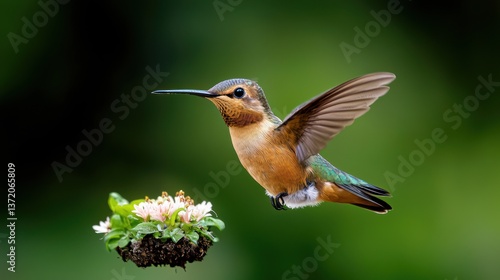 © nugroho, Fototapeta premium Hummingbird in flight near flower cluster