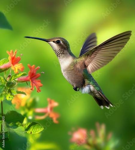 © malayeka, Naklejka premium Hummingbird in flight near orange flowers.