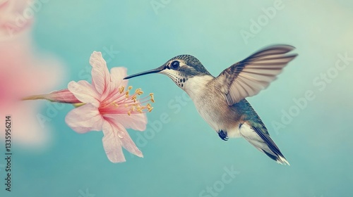© lestari, Fototapeta premium Hummingbird in flight near pink flower