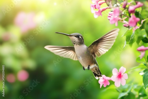 © malayeka, Obraz premium Hummingbird in flight near pink flowers. (3)