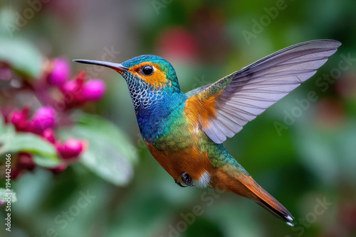 Naklejka premium Hummingbird in Flight Near Pink Flowers