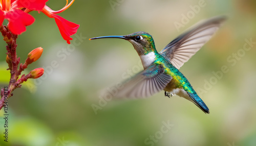 Naklejka premium Hummingbird in Flight near Red Flower