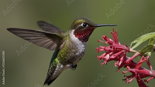 © mysa, Fototapeta premium Hummingbird in flight near vibrant flower
