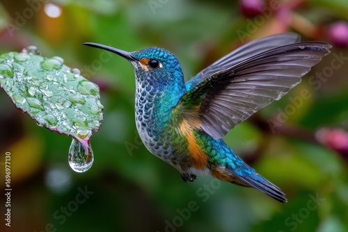 © YouraPechkin, Obraz premium Hummingbird in Flight Near Water Droplet on a Leaf