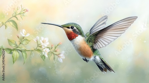 © admin_design, Fototapeta premium Hummingbird In Flight Near White Flowers