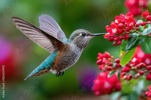 © YouraPechkin, Fototapeta premium Hummingbird in Flight Nectar Feeding Red Blossoms Green Background