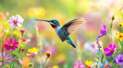 © Rere_Art151, Fototapeta premium Hummingbird in Flight Over a Colorful Wildflower Meadow