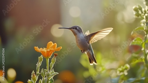 Naklejka premium Hummingbird in Flight over Orange Flower
