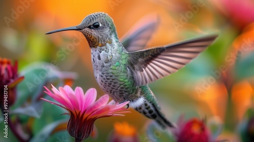 Naklejka premium Hummingbird in Flight Over Pink Flower