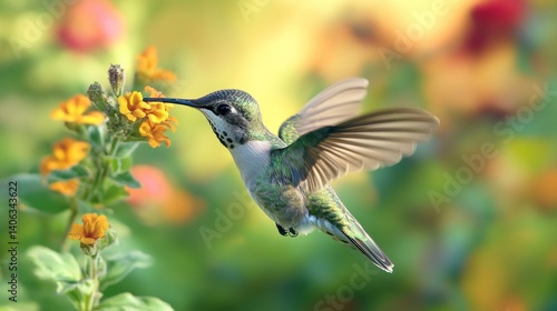 Fototapeta premium Hummingbird in flight sipping nectar from orange blossoms in a vibrant garden...