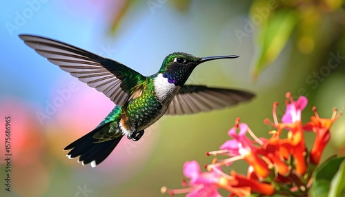 Fototapeta premium Hummingbird in flight, vibrant colors, bright flowers