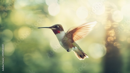 © Penatic Studio, Fototapeta premium Hummingbird in Flight with Blurred Green and Yellow Background