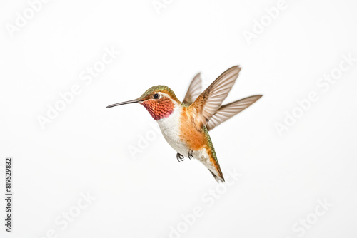 © Rysak, Fototapeta premium Hummingbird in Flight with Blurred Wings Against White Background