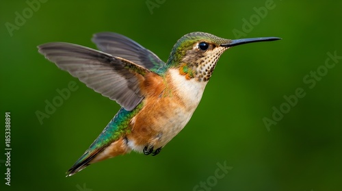© ye, Fototapeta premium Hummingbird in Flight with Blurred Wings and Green Background