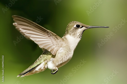 Obraz premium Hummingbird in Flight with Detailed Feathers and Green Background