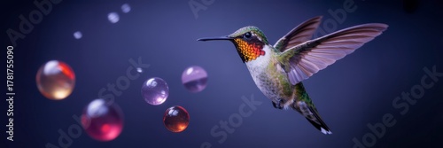 © ArotiRani, Obraz premium Hummingbird In Flight With Glowing Orbs Against Blue