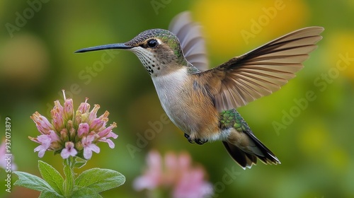 © ari, Fototapeta premium Hummingbird in Flight with Pink Flowers