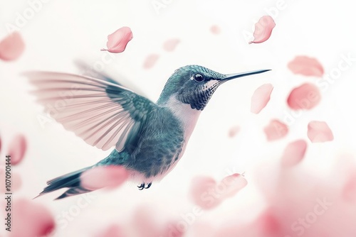 Naklejka premium Hummingbird in flight with pink petals.