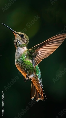 © Audy, Fototapeta premium Hummingbird in Full Flight Against Dark Background
