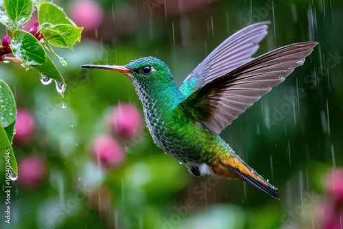 © YouraPechkin, Fototapeta premium Hummingbird in Rain Near Blossoming Flowers