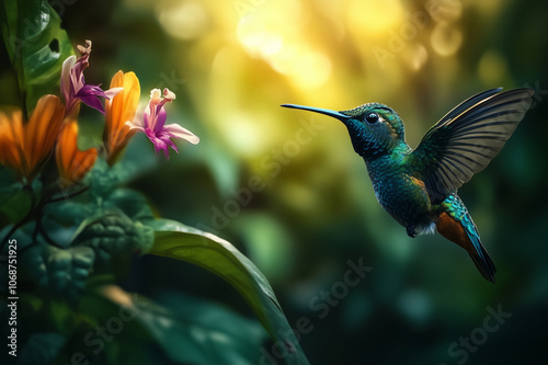© quickshooting, Naklejka premium hummingbird in the tropical forest
