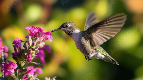 Fototapeta premium Hummingbird marvel: Nectaring with grace and speed in a vibrant garden setting