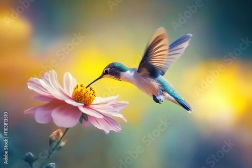 © Bernardo, Fototapeta premium Hummingbird Mid-Flight Feeding on a Pink Flower with Blurred Wings and a Vibrant Soft-Focus Background
