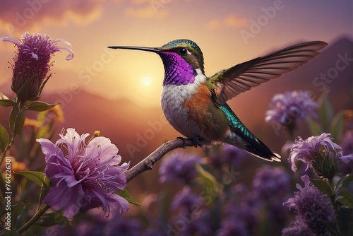© alexx_60, Fototapeta premium Hummingbird on Top of a Purple Flower: Bright and Colorful Image