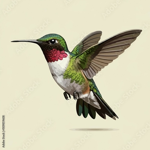 © Nurzhan, Fototapeta premium Hummingbird on white background. Colubris archilocus. Flying North American Ruby-troathed hummingbird with colorful glossy plumage: distinctive red throat and green reflections on the back.