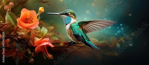 Fototapeta premium Hummingbird perched elegantly in a nest with beautiful flowers around it a captivating scene depicted in a copy space image
