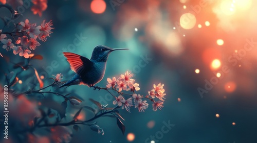 © IMAGINIAC, Fototapeta premium Hummingbird Perched on Blossom Branch at Sunset