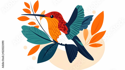 Fototapeta premium Hummingbird perched on branch, autumn leaves, nature illustration, design...