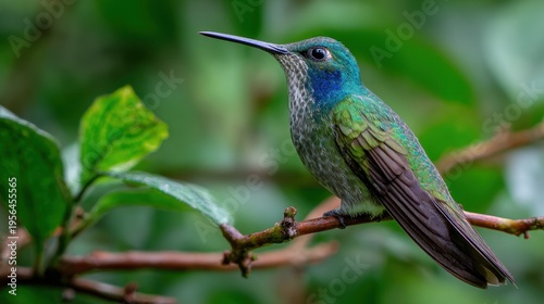 Obraz premium Hummingbird perched on branch in green foliage natural background