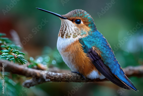 © YouraPechkin, Fototapeta premium Hummingbird Perched on Branch in Green Forest