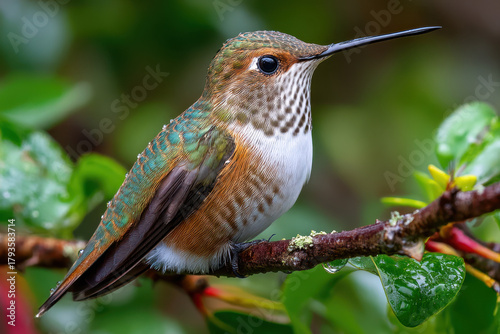 Obraz premium Hummingbird Perched on Branch in the Rain