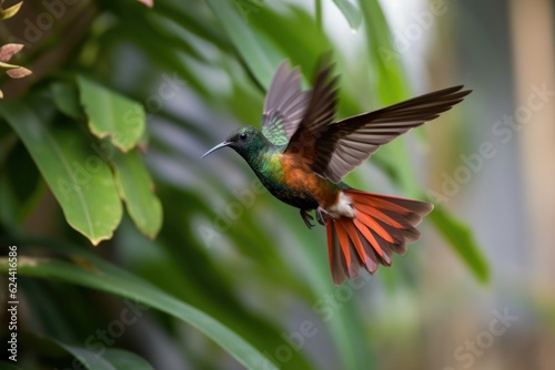Fototapeta premium hummingbird practicing flying skills, hovering and darting around the yard, created with generative ai
