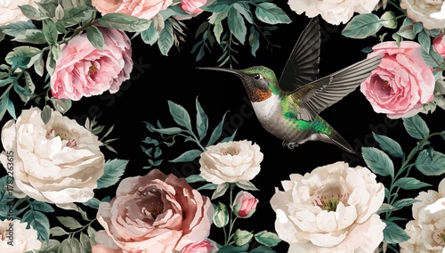Fototapeta premium Hummingbird, roses, peony leaves on dark backdrop, ideal for UI backdrop