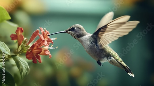 © Kopgz-41, Obraz premium Hummingbird's Delicate Sip: Nectar Feast in Mid-Air