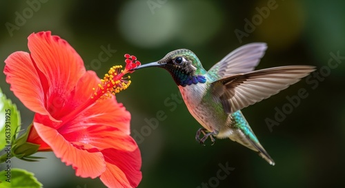 Fototapeta premium Hummingbird's graceful flight and vivid hibiscus bloom, capturing delicate...